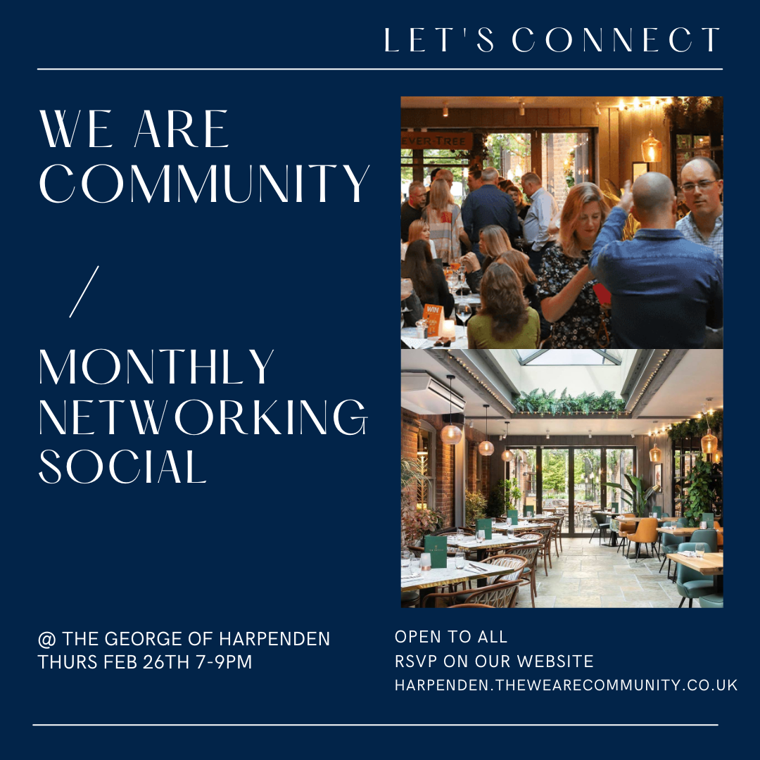 We Are Community welcomes you to come and connect with other local businesses, creatives and members of the community at our members location The George Of Harpenden on Thurs 26th Feb 7-9pm.